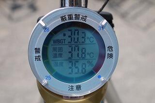 本日も午前中から強い日差しを受け、気温が上昇しました。午前12時40分のWBGT計を見ると日向の気温は37.2℃で体温越えでした。WBGTの値も29.4と高くなっていました。午後1時にはこの値が30.6になり、危険レベルに近くなりました。