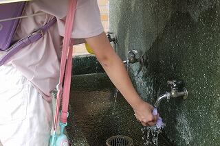 下校前にハンカチを濡らしています 高学年児童も日傘を使用しています