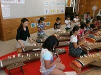 今年度本校は、文化庁の事業である学校巡回公演が実施できることとなり、10月6日に、邦楽の公演を行っていただきます。それに先立ち、5年生の児童に、「琴の体験をしよう。」というワークショップを行っていただきました。講師は、日本三曲協会の皆様です。児童分の琴を用意してくださり、一人一人十分琴に触れさせていただくことができました。爪の付け方や音の出し方、「さくら さくら」の演奏の仕方、琴と箏の違い等丁寧に教えていただきました。最後には、多くの児童が「さくら さくら」を上手に演奏できるようになり、リコーダーとの合奏を楽しみました。