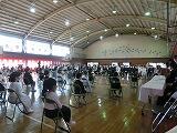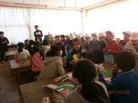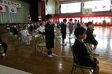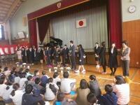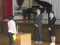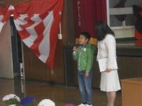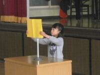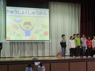 今日は集会の時間に給食感謝の会を行いました。えいようの歌を歌い、給食の歴史の紙芝居、クイズなどをしたあと、児童代表の作文を発表し、調理員さん代表の方にプレゼントを渡しました。
