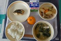 <今日の給食> ご飯・牛乳・ほっけ文化干し・豚肉と大根の煮物・里芋の味噌汁・みかん