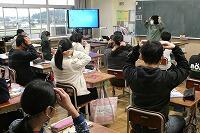 中学校の英語の授業の様子を紹介していただいたり、模擬授業として、スポーツや動物などの名前を英語で3つ言ってみる「ネーム3」や、英語のセリフを聞きながら、示された身体の部位に触れる「サイモン・セッズ」ゲームを行ったりして、英語の授業を楽しみながら過ごすことができました。