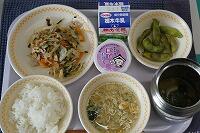 <今日の給食> ご飯・牛乳・豚肉とにらのキムチ炒め・中華風卵スープ・黒大豆枝豆・とち介巨峰ゼリー