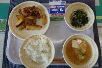 <今日の給食> ご飯・牛乳・豚肉とさつまいものかりん揚げ・ほうれん草のおひたし・白菜と厚揚げの味噌汁
