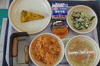 <今日の給食> チキンライス・牛乳・パンプキンスペイン風オムレツ・シーザーサラダ・野菜スープ・ミックスベリープリン