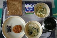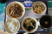 <今日の給食> ご飯・牛乳・豚肉のスタミナ炒め・ほうれん草のナムル・わかめと卵のスープ