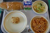 <今日の給食> 減量アップルパン・ツナのトマトソーススパゲティ・牛乳・チキンのパン粉焼き・フレンチサラダ