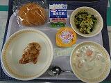 <今日の給食> チキン竜田サンド・ノンエッグタルタルソース・牛乳・枝豆のサラダ・ジャーマンスープ