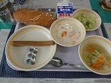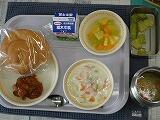 <今日の給食> バターロールパン・牛乳・ハンバーグトマトソース・クラムチャウダー・フルーツジュレポンチ