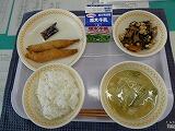 <今日の給食> ご飯・牛乳・イワシのおかか煮・小松菜の磯か和え・豚汁・福豆
