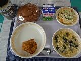 <今日の給食> ココア揚げパン・牛乳・茎わかめサラダ・ポークビーンズ