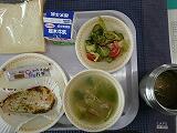 <今日の給食> スライスミルクコッペパン・ツナサンド・牛乳・ゆで野菜サラダ・もち麦入りミネストローネ・お米のガトーショコラ