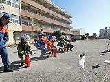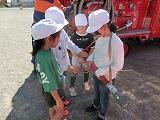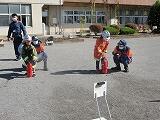 消防車見学のあとは、一人ひとりが消火活動体験です了解消防団の方々が、子どもサイズの消防服を用意してくださり、見た目も消防団そのもの!「火事ですお知らせ」と周囲の人に知らせてから放水開始です笑う