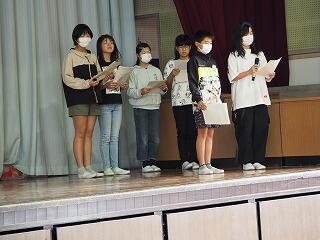 前期多読賞(4月から9月までの間に、図書室の本を多く借りて読んだ人)や読破賞(各学年の課題図書8冊を読み終わった人)、標語賞、うちどくキャッチフレーズ賞の賞状を渡しました。おめでとうございます!!10月から2月までの間で、後期多読賞を選びます。ぜひ、たくさんの本を読んでください。また、課題図書を読み終わった人全員に読破賞の賞状がありますので、まだ読み終わっていない人は、最後まで頑張りましょう。