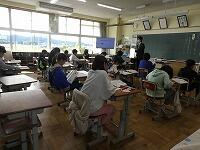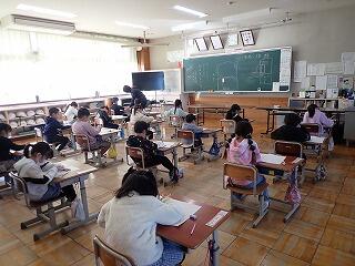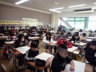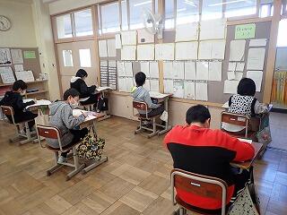 本日学力テストを実施しました。1年から3年生は、国語・算数の2教科、4年生から6年生は、国語・算数・理科の3教科の調査を行いました。CDを聞いて問題に答える聞き取りの問題やコンパスを使って図形を作図する問題等に真剣に取り組んでいました。