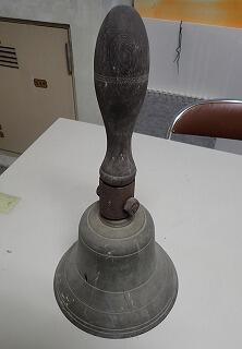 2階の資料室には、いろいろなものが保管されています。今回は学校にチャイムが普及する前に使用していたと考えられる鐘をみつけました。約60年前にはすでにチャイムは普及していましたので、それより前に使用されていたものだと考えられます。今でも左右に振るとよい音色を出すことができます。