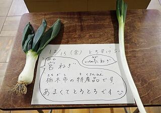 吹上小学校の給食は、多くの栃木市産の食材を使用しています。1か月に1回程度、とち介ランチの日があり、特に多くの栃木市産の食材を取り入れたメニューになっています。本日はとち介ランチの日でした。子どもたちの大好きな「とち介たまごやき」の他に「みそすき焼き煮」が出ました。その中の豚肉、はくさい、しいたけは栃木市産のものを使用しました。さらにねぎは吹上地区の伝統野菜の「宮ねぎ」を使用しました。