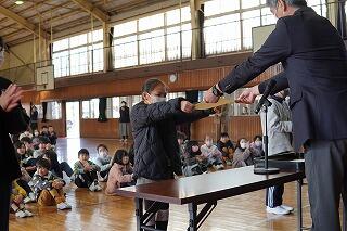 陸上交歓会のリレー優勝の表彰         校内持久走大会の表彰