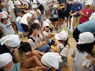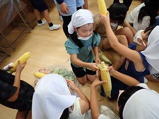 とうもろこしが旬の季節になりました。明日の給食にとうもろこしが出ます。今日の昼休みに、とうもろこし皮むき体験会が行われました。放送で体験希望の児童を募ったところ、たくさんの児童が集まり、一生懸命皮むきをしてくれました。6年生児童もたくさんきてくれました。そして下学年の児童を優しくサポートしている姿が見られました。