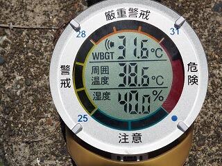 日向のWBGT計が31.6を表示し危険領域の数値。(12時30分)