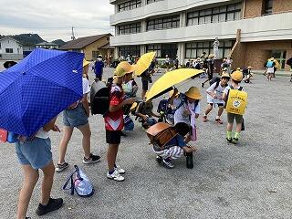 登下校中も熱中症になる心配があります。結構多くの児童が日傘を使用し対策をしています。