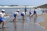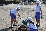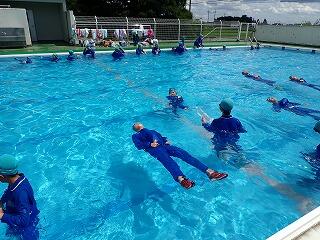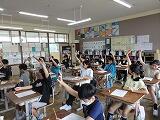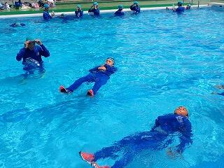 7月20日に6年生が着衣泳に取り組みました。現在の学習指導要領では、5・6年体育の水泳運動として、クロールと平泳ぎをできるようにするという内容の他に安全確保につながる運動が示されています。安全確保につながる運動の1つとして、背浮きが例示されています。また、着衣のまま水に落ちた場合の対処の仕方についても積極的に取り扱うこととされています。今回は6年生が着衣のまま背浮きをして呼吸を確保し、自分の命を守るための技能を高めました。