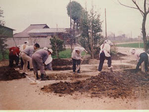 PTAの奉仕作業でプール予定地にあった砂場を、別の場所に移設しています。(昭和43年4月)
