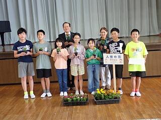 栃木市では、子どもたちが協力して花を育てることにより、優しさと思いやりの心が芽生えることを目的として、人権擁護委員の方が小学校を訪問して草花を贈呈する人権の花運動を進めています。今年度は吹上小学校がその対象校になりました。6月1日に緑化委員の児童が代表して花の苗を受け取りました。この花の苗は栃木農業高校の草花部の生徒さんが育ててくれたものだそうです。その後の緑化委員の活動として花壇に移植しました。人権の花は、夏休みになってさらに美しく咲き誇っています。