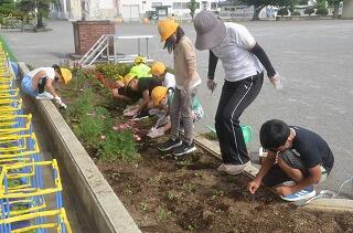 緑化委員会の活動です。人権の花の花壇も緑化委員の皆さんで移植しました。人権の花の花壇は南側駐車場の近くにありますので、学校にお越しの際には、どうぞご覧ください。