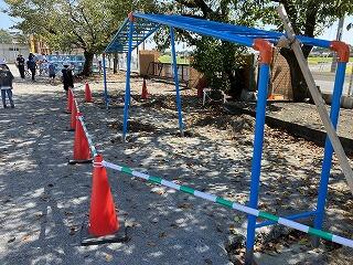 テントを新調しました。6本足のものと4本足のものがあります。令和5年7月と記されていますが、5月の運動会から使用を開始しています。