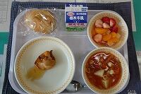 <今日の給食> 市産米粉パン・牛乳・鶏の照り焼き・ミネストローネ・イチゴ入りフルーツポンチ