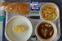 <今日の給食> ミルクコッペパン・牛乳・オムレツ・ビーフシチュー・コールスロー・ミルメークコーヒー
