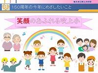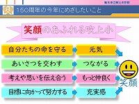 そして、150周年の記念すべき今年、子どもたちと先生と一緒に目指したい学校について話しました。それは、「笑顔のあふれる吹上小」です。子どもたちにつけたい力として示している3つの力「自分たちの命を自分たちで守る力」「進んであいさつを交わす力」「お互いの考えや思いを伝え合う力」、そして、「目標に向かって努力し続ける」ことは、どれも自分や家族、周りの人たちを笑顔にすることに繋がることを伝えました。最後に、「みんなで協力してくれますか?」と尋ねると、「はい!」と元気な返事を返してくれました。きっと素晴らしい年になると思います。