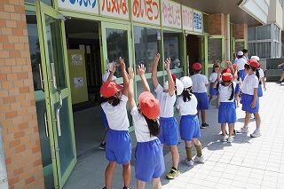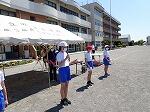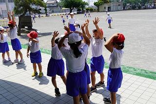 この2日間、最高気温が30℃を超えるなかで運動会の練習が続いています。熱中症予防対策として、こまめな水分補給の時間を設けています。また、昇降口付近にミストシャワーが稼働しました。子どもたちはこまめに水分補給をしたり、ミストシャワーで涼んだりしていました。