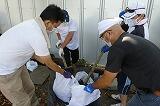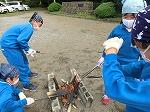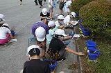 桶に水をはり、一人一人「もみ洗い」、「つまみ洗い」で体育着を洗いました。