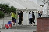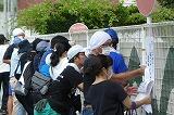 フェンスに付けた印に合わせて間隔を取って準備体操を行いました。