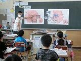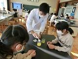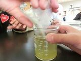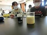 次に「薬を使う時の約束」を教えていただきました。薬は何で飲むのがよいか?実験をとおして、視覚的に理解しました。鉄剤(貧血治療薬)を水に入れると何の反応も示しませんが、緑茶に鉄剤を入れるとすぐに黒色に変化しました。オレンジジュースに重曹を加える実験では、ビーカーが泡であふれそうになり、薬は水で飲まないといけないことを学びました。ご多忙中にもかかわらず、授業をしていただき、半田先生ありがとうございました。