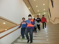 いよいよ避難訓練開始です。緊急地震速報のチャイム音を聞いて、一時避難します。何度かショートの避難訓練を重ねてきたので、これは比較的静かに、スムーズに行うことができました。その後、大地震が発生し、揺れが収まるのを机の下で待ちました。長い時間静かに待つのは、特に低学年にはちょっと難しかったようですが、頑張りました。