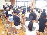 本日の朝の活動でプール開きを行いました。スポーツ委員会の5・6年児童が校内放送を利用して進めました。まず、校長先生からプール開きに関するお話がありました。次に児童代表の言葉で代表の6年生が「平泳ぎで25m泳げるようにしたい。」等の発表がありました。それからプールを使う時の3つの約束を5年生代表2人が先導して言いました。教室の児童みんなで後に続いて言いました。最後に体育主任の先生から、プールの安全に関する話がありました。