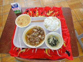 今日の給食はとち介ランチの日でした。メニューは、ごはん、牛乳、豚肉の新生姜焼き、ナムル、トマトとたまごのスープでした。栃木市産の食材として、お米、たまご、豚肉、もやし、トマト、ほうれんそうが使われていました。