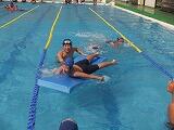 4~6人が一組となり、チームの一人を舟に乗せて25mプールを渡すリレーです。