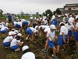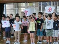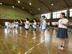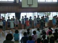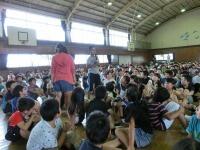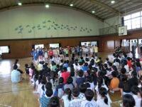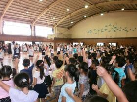低、中、高学年が違ったリズムをうちながらの、全校生でのセッション。
