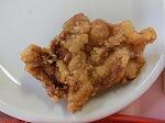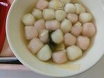 明日の卒業を祝っての献立です。メニューは、赤飯、鶏肉の唐揚げ、五目きんぴら、湯葉のすまし汁、お祝いケーキ、牛乳です。