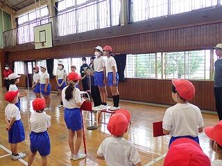 6年生にとって小学校最後の運動会になりますので、運動会の閉会式において6年生が活躍する場面がたくさんあります。成績発表・優勝旗授与・閉会の言葉などで6年生の代表が表舞台に立ちます。今日の午前中は雨で校庭が使えなかったので、体育館でこれらの練習をしました。