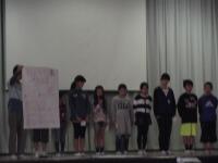 読書集会では、図書委員が中心となって、人気の本ベスト3の紹介や読書クイズの発表、絵本の読み聞かせを行いました。読み聞かせでは「すてきな三にんぐみ」の絵本を取り上げ、映像と一緒に全校児童に向けてお話をしました。