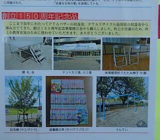 150周年記念品は、朝礼台、テント4張、体育館用折りたたみ椅子70脚、図書の本、うんてい、記念樹