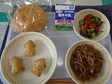 <今日の給食> 減量バターロールパン・牛乳・いかナゲット・焼きそば・トマトのごまドレッシング