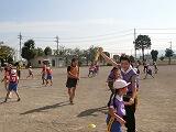 ラグビーボールや色々なボールを自分の陣地に集めるゲームです。攻守を交代しながら、2チーム対抗で行いました。攻撃側は、コートの反対側にある陣地にボールを運びます。防御側は、攻撃側のタグを取って、ボール運びを防ぎます。チームで声を掛け合い、最後の力を振り絞って頑張りました。
