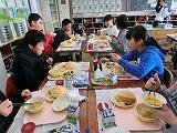 体験の後には、ボランティアの皆さんと一緒に給食を食べました。子どもたちは、箏を始めたきっかけなど、いろんなことを質問していました。