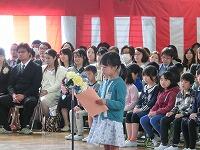 式では、担任の先生の呼名に、元気に「はい」と返事をすることができました。また、在校生を代表して2年生の野尻さんが、お迎えの言葉をしっかりと発表することができました。